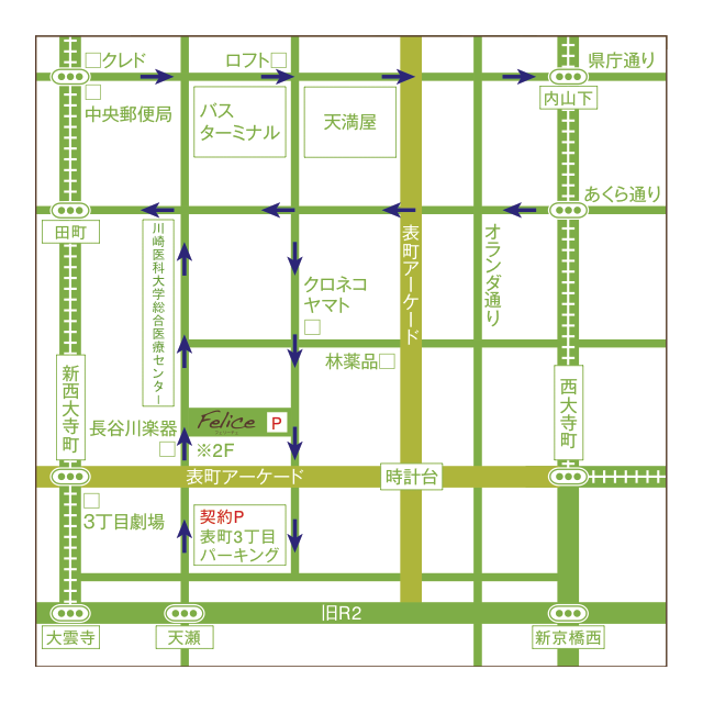 岡山電気軌道東山線西大寺町駅からは西に向かって商店街を歩いてください、商店街の時計台の次の交差点を右に折れていただくと緑の看板が見えます。 新西大寺町駅からは東に向かって。長谷川楽器店さんの先に見えます理容店のサインポールを超えて、次の交差点を左に。 |