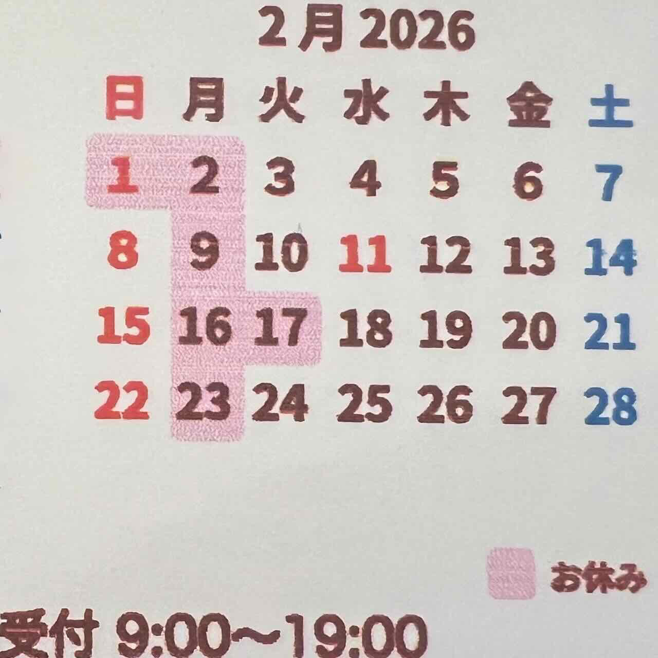 2月のお休みご案内